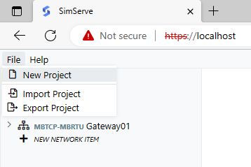 - In the SimServe web interface, click on "File" in the main menu and then on "New Project".